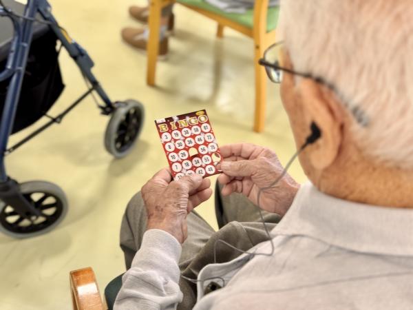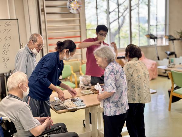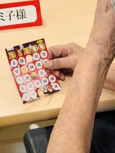 自分のカード(25マス)の中から読み上げられた数字を探し当てるのは右脳トレーニングにもなりますね。認知機能が少し低下しているご利用者様はどうしても見つけられない方もいらっしゃいます。職員が横について少しサポートしたり応援したりして一緒に盛り上がりました。