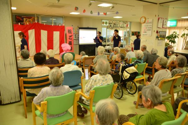猛暑日中でしたが、当施設は元気に営業しました。ご家族のみなさまもたくさん面会に来られ、お孫さんや曾孫さんの笑顔に、ご利用者さまも自然と頬がほころびます。やっぱり家族の力は大きいですね。