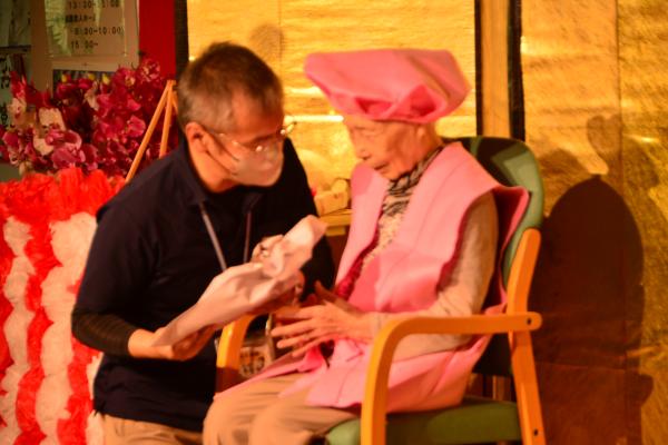 お祝いの式典では施設代表で園長からご長寿表彰を、またスタッフご利用者様一同から写真や手形、花束、ご利用者様みんなで作った手作りクラフトなどを贈呈。
