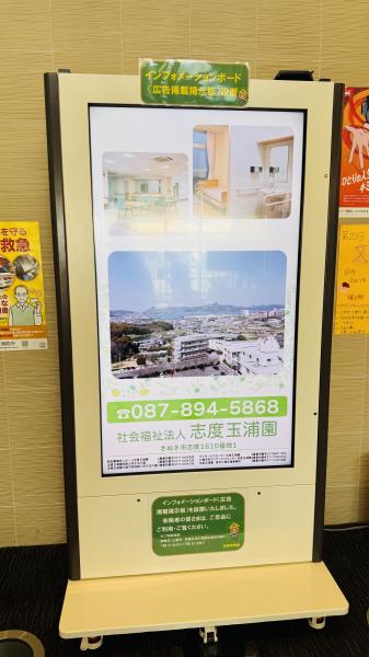 9月29日よりさぬき市民病院さまの待合いフロアと会計カウンターに地域の企業、法人の情報を表示するインフォメーションボードとモニターが設置されました。志度玉浦園も協賛させていただきインフォメーションが流れますので、受診等で訪れた際はご覧になってみてくださいませ。